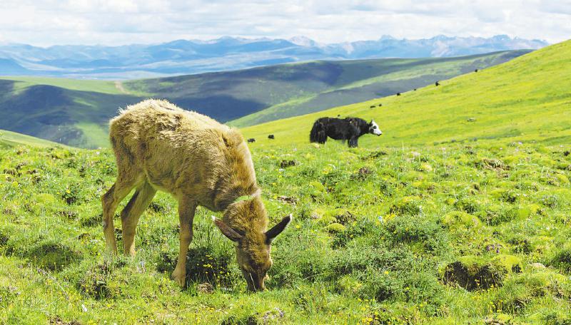 小白唇鹿每天都會(huì)跟著達(dá)瓦拉姆家的牦牛群在高原牧場(chǎng)吃草玩耍。尹鋼 攝