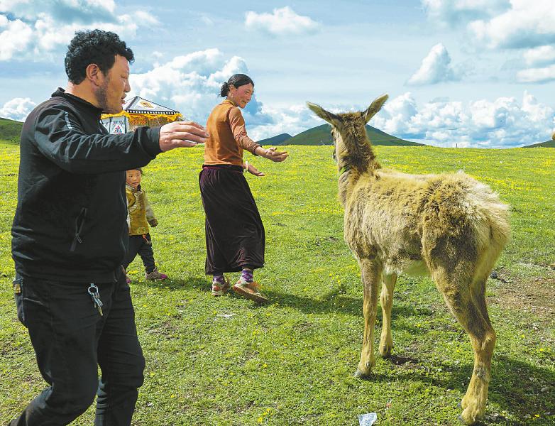 2022年7月14日,在海拔4450米的四川省甘孜州白玉縣安孜鄉(xiāng)門(mén)馬一村高原牧場(chǎng),一只國(guó)家二級(jí)保護(hù)動(dòng)物白唇鹿跟隨牧民達(dá)瓦拉姆家的牦牛群,悠閑地在草場(chǎng)上覓食青草。吃飽喝足后的小鹿回到牧民定居點(diǎn)的達(dá)瓦拉姆家門(mén)口,還會(huì)主動(dòng)把頭伸到達(dá)瓦拉姆的懷里蹭來(lái)蹭去,呦呦地叫著賣(mài)萌。