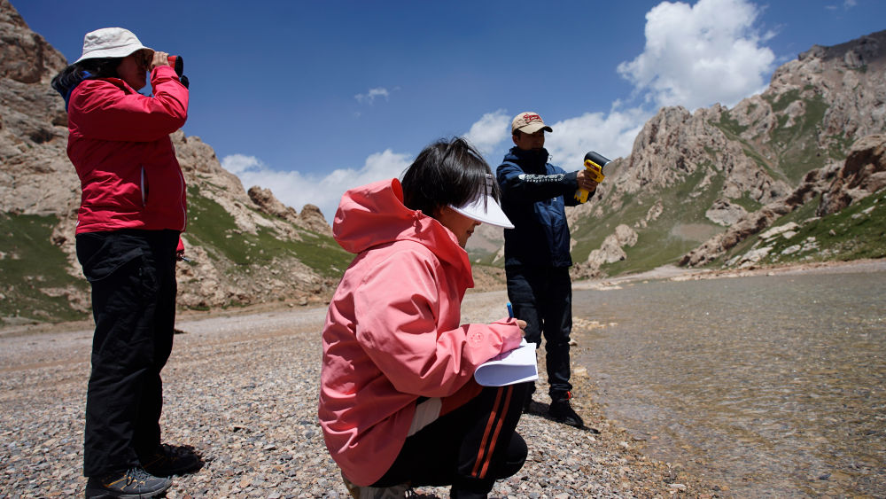 7月27日,來(lái)自青海省水文水資源測(cè)報(bào)中心的江源科考隊(duì)員在測(cè)量河流流速和記錄數(shù)據(jù)。新華社 陳杰 攝