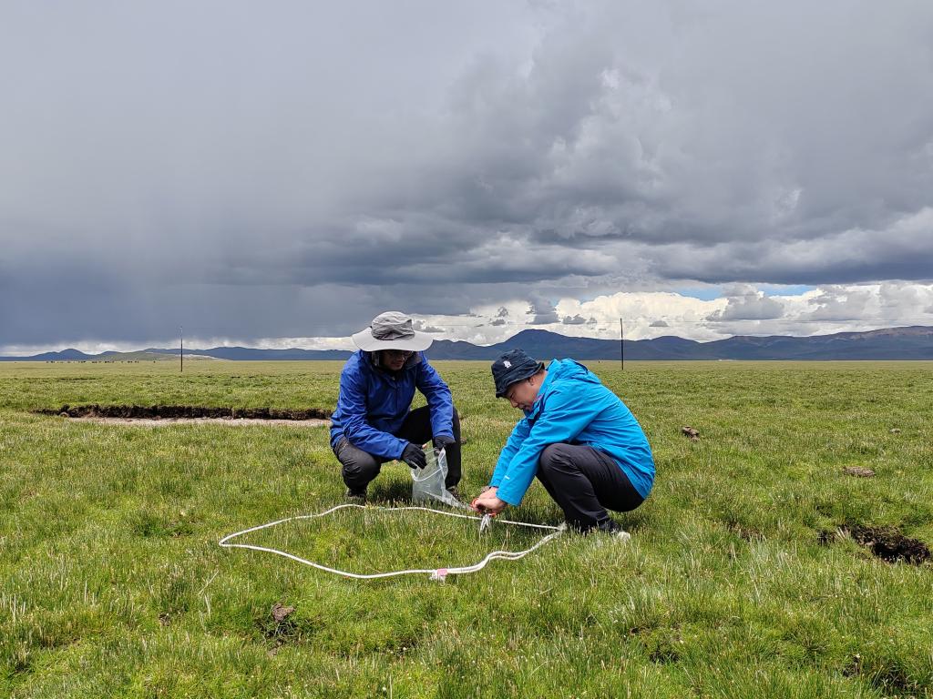 7月17日,科考隊(duì)員任斐鵬(右)和孫寶洋在觀測(cè)自然狀態(tài)下高寒草甸生態(tài)系統(tǒng)狀況。(受訪者供圖)