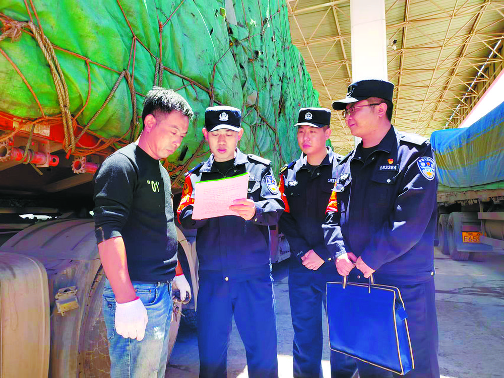 沱沱河站派出所所長沈衛(wèi)平(左二)和民警們一起向客車司機(jī)宣傳愛路護(hù)路知識。青藏鐵路公安局格爾木公安處供圖