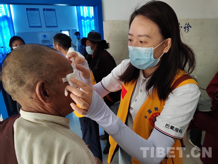 圖為志愿者為白內(nèi)障患者整理紗布