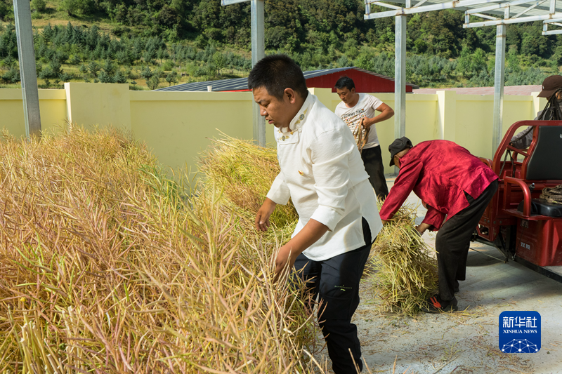 四川省阿壩藏族羌族自治州金川縣二普魯村,村民在收割油菜(8月24日攝)。新華社記者 唐文豪 攝
