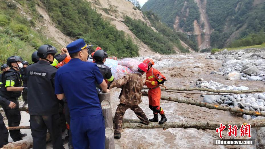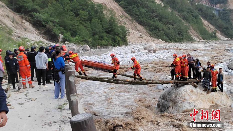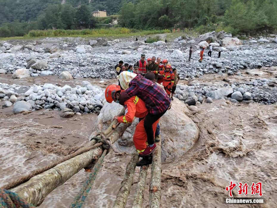 森林消防員抬著受傷群眾過河。四川森林消防供圖 攝