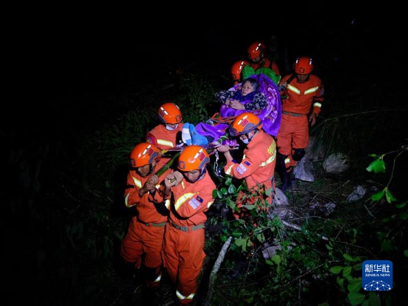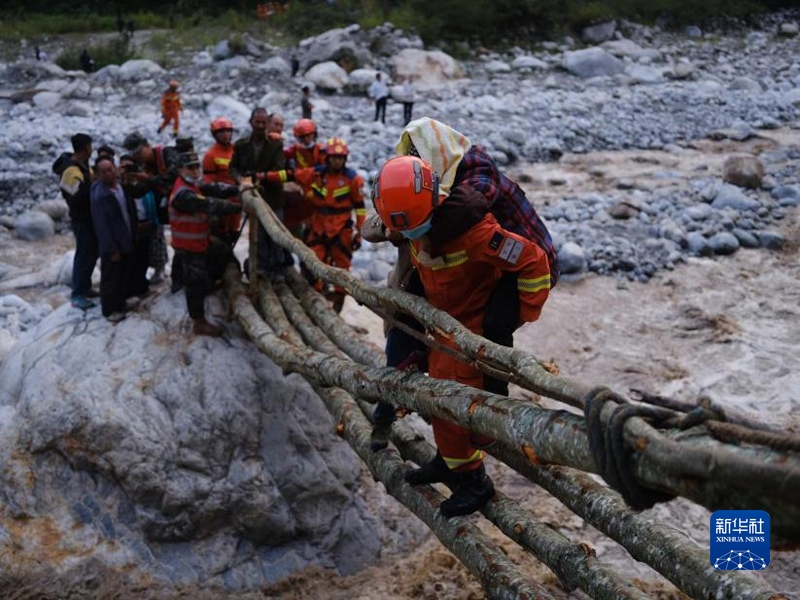 9月5日,四川省森林消防總隊甘孜支隊消防員在瀘定縣磨西鎮(zhèn)青崗坪村轉(zhuǎn)移群眾和傷員。程雪力 攝
