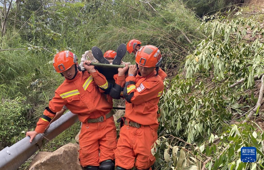 9月6日,四川森林消防總隊(duì)甘孜支隊(duì)消防員在瀘定縣得妥鎮(zhèn)紫雅場(chǎng)村轉(zhuǎn)運(yùn)傷員。新華社 魏紅 攝
