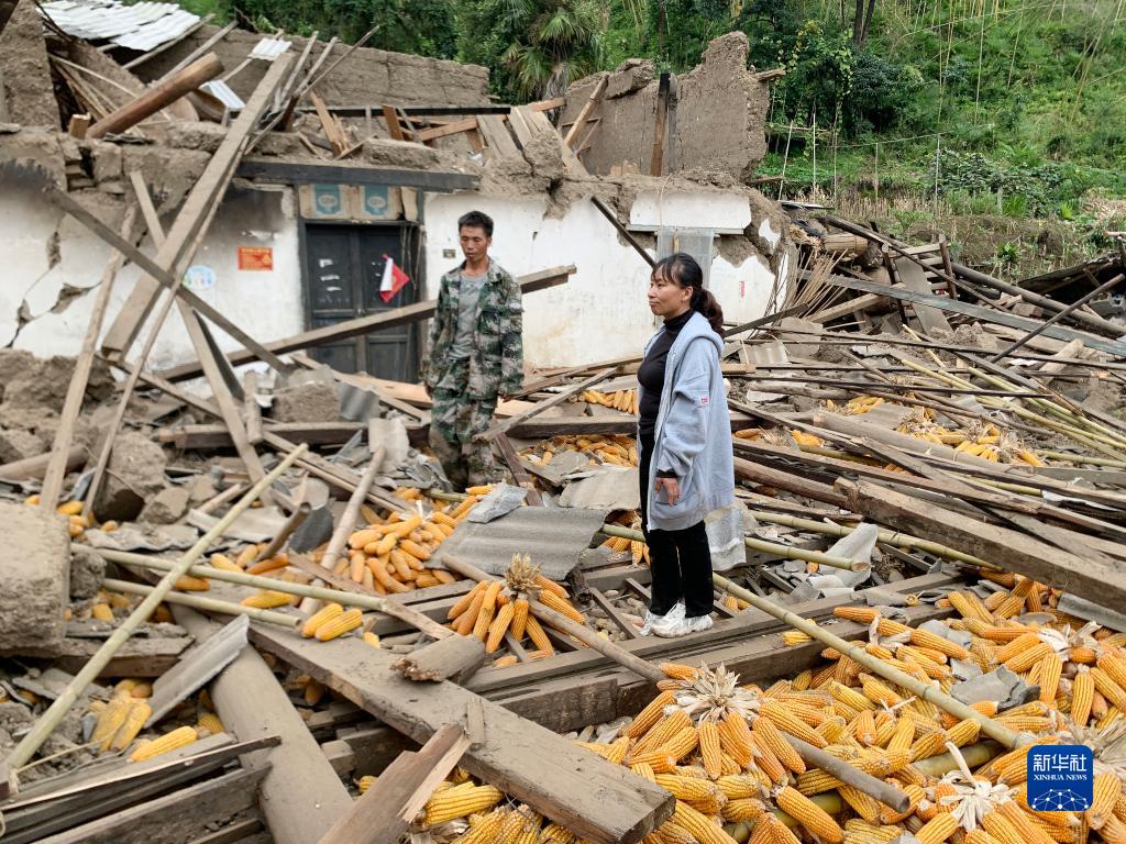 9月7日,在雅安市石棉縣王崗坪彝族藏族鄉(xiāng)幸福村二組,養(yǎng)蜜蜂為生的康貝兵(左)、陳云夫婦站在倒塌的房屋中。新華社記者 才揚(yáng) 攝