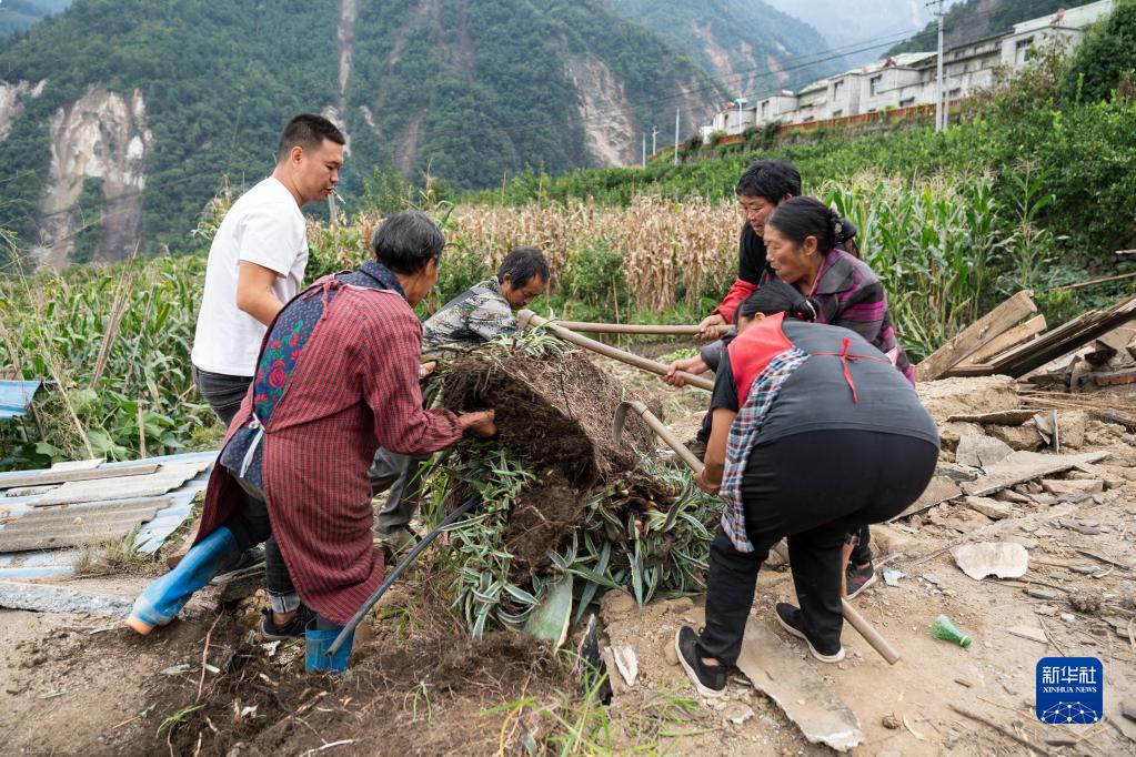 9月7日,在雅安市石棉縣王崗坪彝族藏族鄉(xiāng)幸福村二組,村民清理廢墟。新華社記者 才揚(yáng) 攝