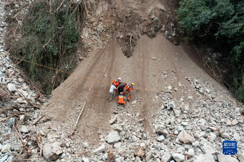 9月7日,在四川省甘孜州瀘定縣磨西鎮(zhèn)附近,四川省成都市消防救援支隊的救援人員轉(zhuǎn)移被困群眾。 新華社記者 沈伯韓 攝