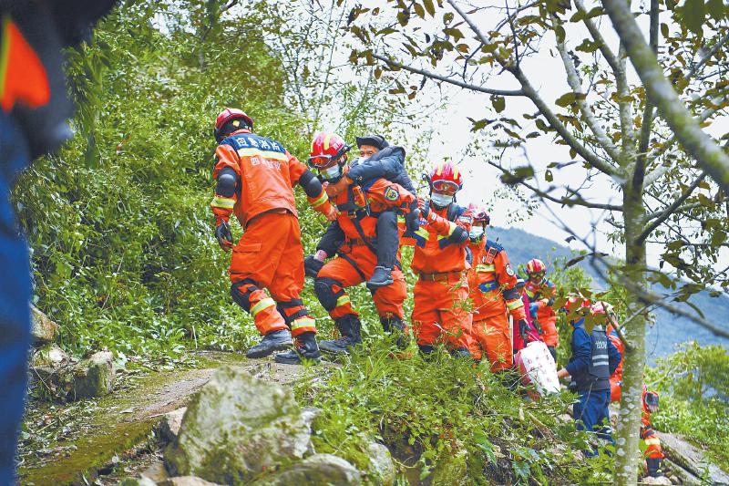 救援隊(duì)員協(xié)助紫雅場(chǎng)村最后一批村民下山,他們隨后將通過水路轉(zhuǎn)移至設(shè)在得妥鎮(zhèn)場(chǎng)鎮(zhèn)的受災(zāi)群眾安置點(diǎn)。 四川日?qǐng)?bào)全媒體記者 楊樹 攝
