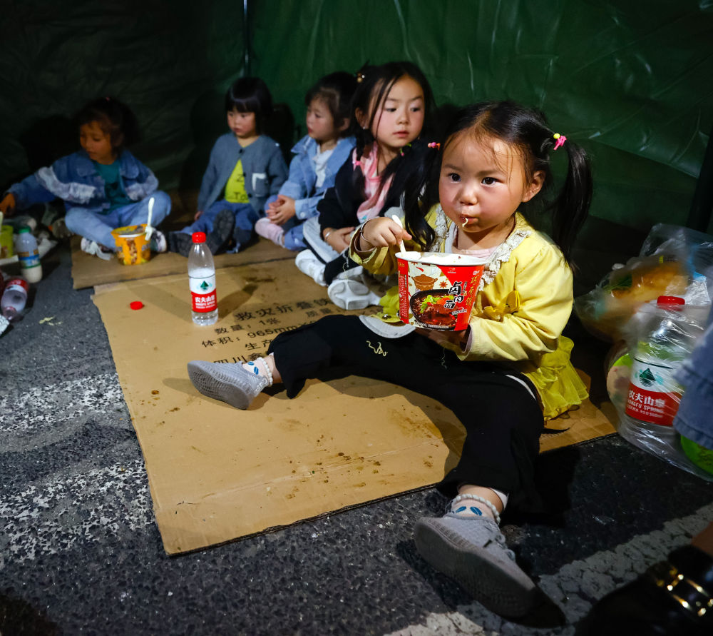 9月5日晚,在磨西鎮(zhèn)的受災(zāi)群眾臨時(shí)安置點(diǎn),幾個(gè)家庭的孩子們?cè)谝粋€(gè)帳篷里吃飯、休息。