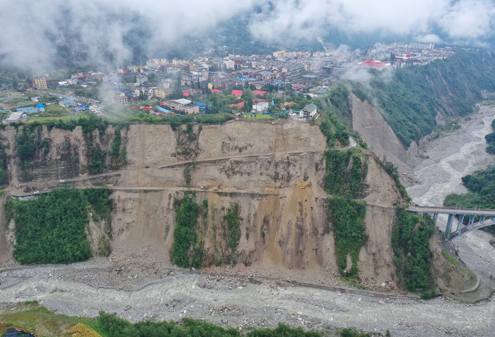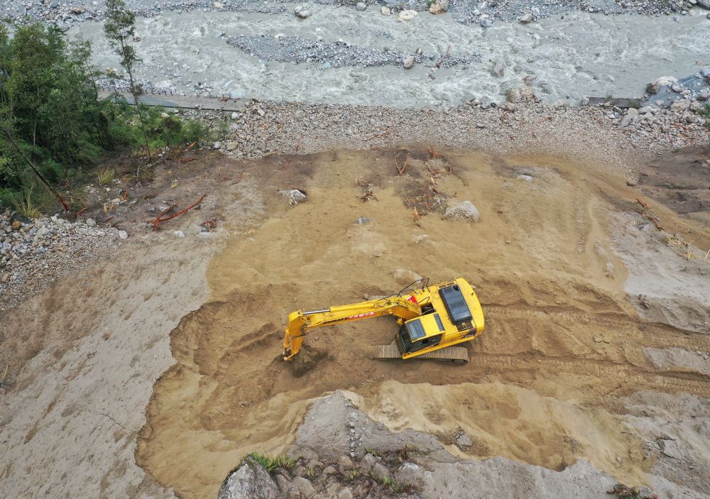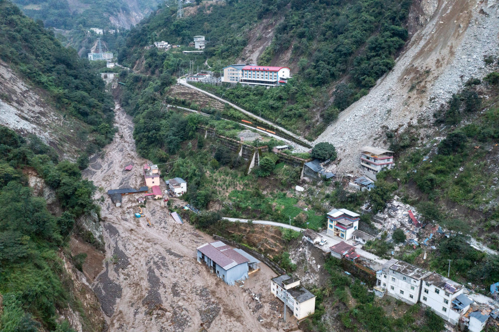 9月7日,在磨西鎮(zhèn)附近,四川路橋的工作人員在搶修通往海螺溝景區(qū)的道路(無(wú)人機(jī)照片)。
