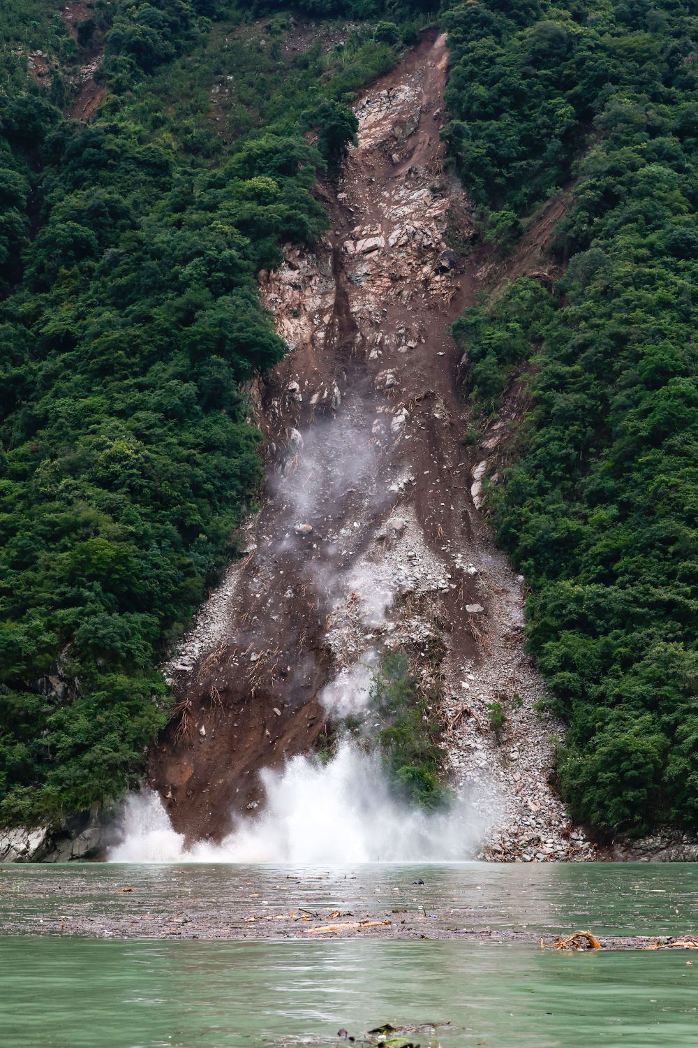 從聯(lián)合村隧道口下到山腳下,是一個(gè)臨時(shí)碼頭。因?yàn)榈刭|(zhì)、道路等條件所限,救援力量只能從這里乘坐橡皮艇,沿水路行至上圖那個(gè)山谷口附近,登陸后沿山路上行,翻過(guò)紅花崗再下行才能進(jìn)入灣東村。坐在橡皮艇里,時(shí)不時(shí)還能看到河畔被地震破壞的山體仍在不停滾下落石,巨大的聲響回蕩在大渡河上空。