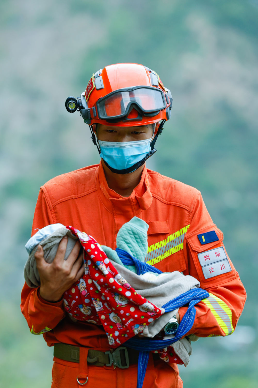 我一路小跑到消防員前面一段距離,拿起帶著長(zhǎng)焦鏡頭的相機(jī),蹲下,拍攝,再向前跑一段,再蹲下,再拍攝。經(jīng)歷了一天差不多10個(gè)小時(shí)的徒步、拍攝,此時(shí)我的體力確實(shí)有些跟不上,為了保證能把這個(gè)場(chǎng)景拍好,只能多拍一些,不留遺憾。消防員沿著土路折了幾道彎才走到聯(lián)合村隧道口的大路,把嬰兒交給值守在那里的瀘定縣人民醫(yī)院的醫(yī)護(hù)人員。此時(shí)我才有時(shí)間和他簡(jiǎn)單聊了聊。他叫張自立,來(lái)自阿壩森林消防支隊(duì)汶川大隊(duì),2個(gè)月大的嬰兒來(lái)自重災(zāi)區(qū)灣東村。經(jīng)過(guò)包括新華社、人民日?qǐng)?bào)、央視等媒體對(duì)這張照片的傳播,他第二天就成了大家口中的“汶川哥哥”。