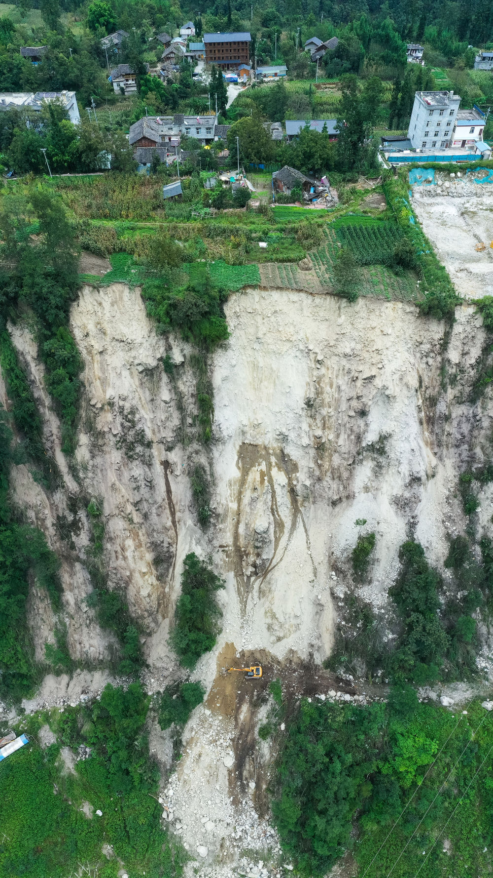 這是9月7日拍攝的幸福村二組附近的照片,可看到山體多處滑坡(無(wú)人機(jī)照片)。