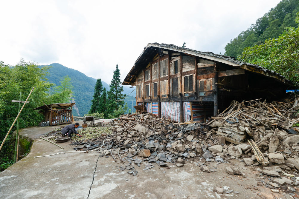 幾經(jīng)周折,終于抵達(dá)共和村最高的村民小組五組。眼前是村民陳松林家的房子,村民鄒先強(qiáng)在散落一地的碎瓦亂石旁幫他清理剛采摘的核桃。陳松林熱情地招呼我們吃核桃和水果。他是村里的種植大戶,種了100多畝核桃和七八十畝魔芋。往年,收個(gè)萬(wàn)把斤核桃不成問(wèn)題,今年只能收3000斤左右。“山垮得厲害,不敢上去收核桃?!标愃闪植粺o(wú)遺憾地說(shuō),“但能收還是盡量要收一些。”不算房子的損失,他家今年經(jīng)濟(jì)損失至少得有六七萬(wàn)元。