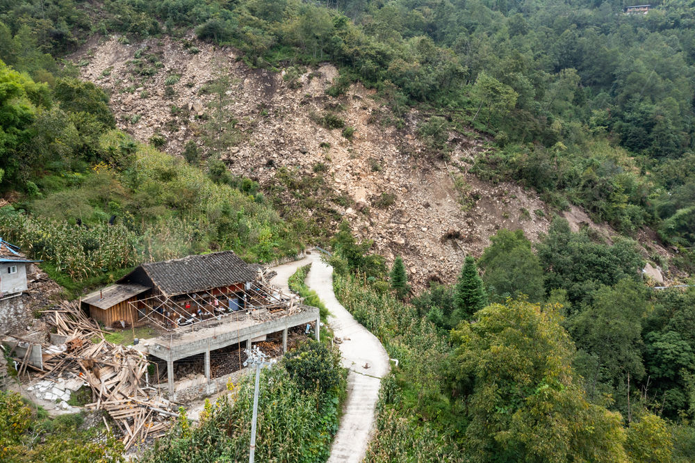9月8日,共和村一組被地震損壞的民房。旁邊坍塌的山體本是盤(pán)山公路,如今已隱入山中不復(fù)存在。