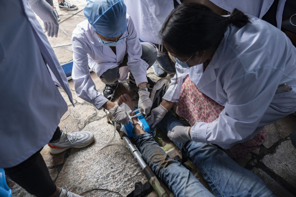 9月6日,在磨西鎮(zhèn)海螺溝廣場(chǎng)受災(zāi)群眾臨時(shí)安置點(diǎn),醫(yī)護(hù)人員為傷員包扎。