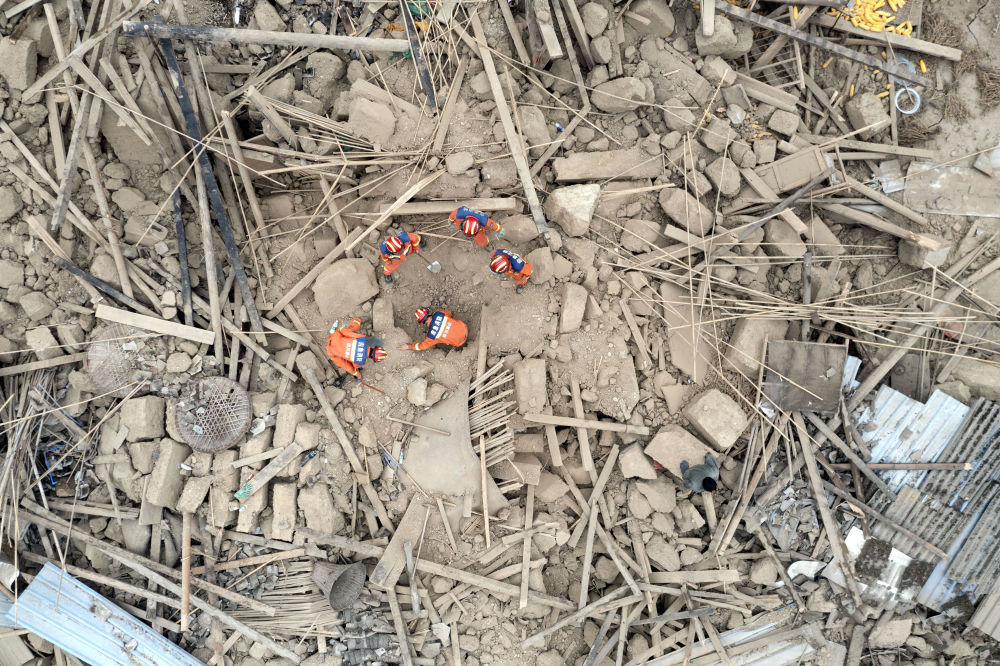 9月7日,在幸福村二組,四川眉山消防救援隊(duì)隊(duì)員幫助村民在倒塌的房屋中找尋物品(無(wú)人機(jī)照片)。