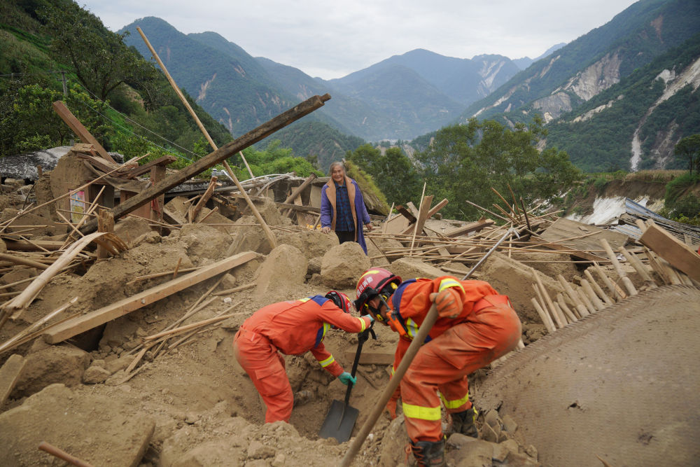 9月7日,四川眉山消防救援隊(duì)隊(duì)員在幸福村二組,幫助村民在倒塌的房屋中找尋物品。