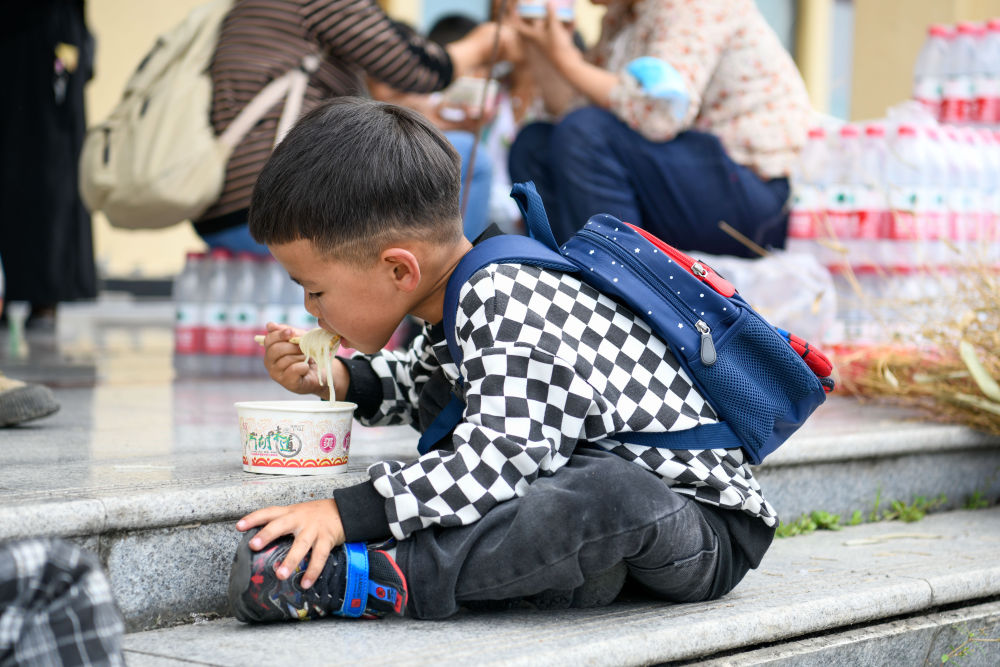 9月7日,學(xué)生在草科鄉(xiāng)中心小學(xué)內(nèi)吃午飯。