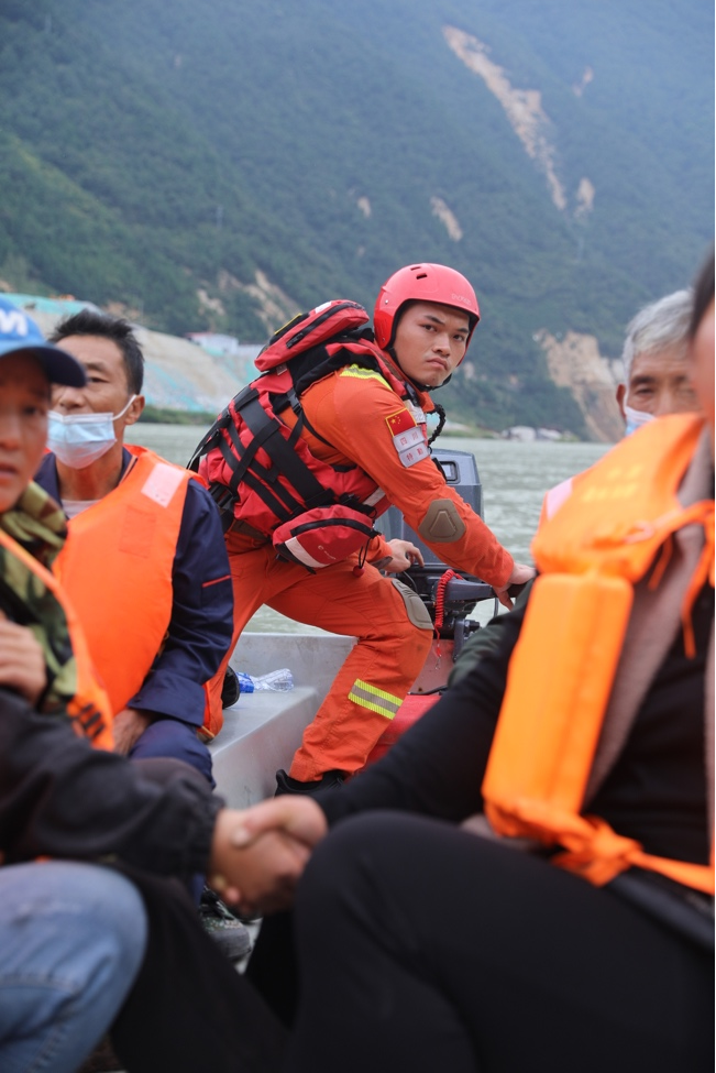 9月6日,救援人員乘坐橡皮艇經(jīng)水路,再爬山路進(jìn)入灣東村。