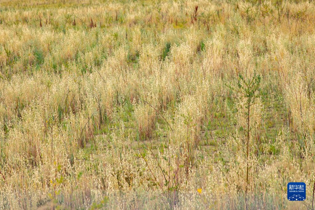 這是黃河瑪曲段干流沿岸一處阻沙林帶建設(shè)區(qū)域的草方格沙障內(nèi)的植被(9月16日攝)。新華社記者 郎兵兵 攝