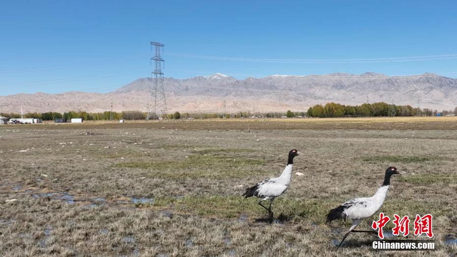 圖為黑頸鶴群在互相觀望。烏蘭縣融媒體中心 供圖