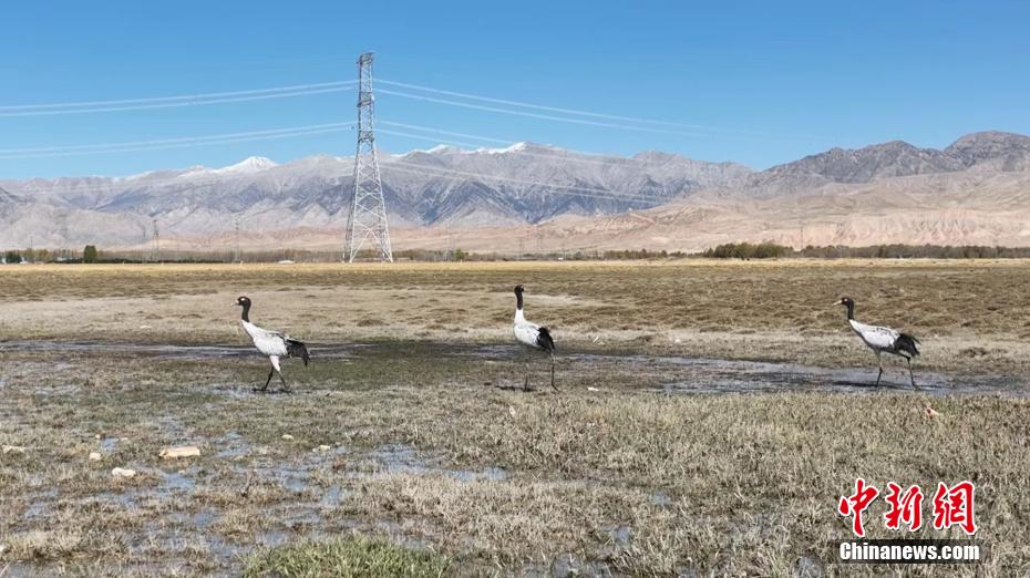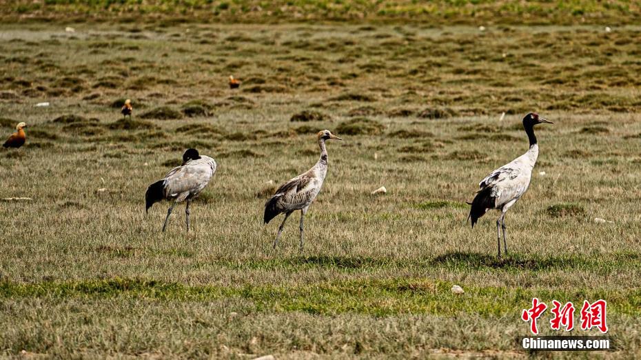 圖為黑頸鶴群踏著黑色細(xì)長的腿閑庭信步。 烏蘭縣融媒體中心 供圖