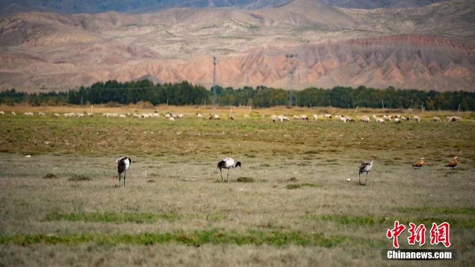 圖為黑頸鶴群在覓食。 烏蘭縣融媒體中心 供圖