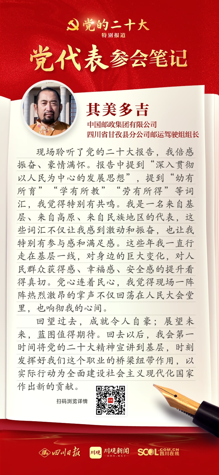 出席盛會,來自四川的黨代表深感使命光榮、責任重大,大家認真履職,結合報告談認識、談體會、談打算。川觀新聞特此推出“黨代表參會筆記”欄目,分享黨代表們的參會心得,敬請垂注。