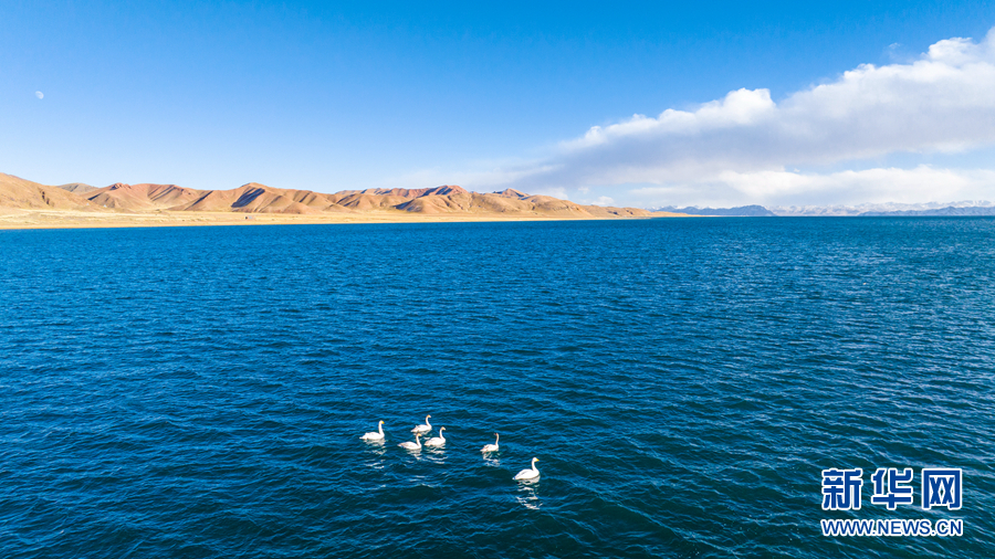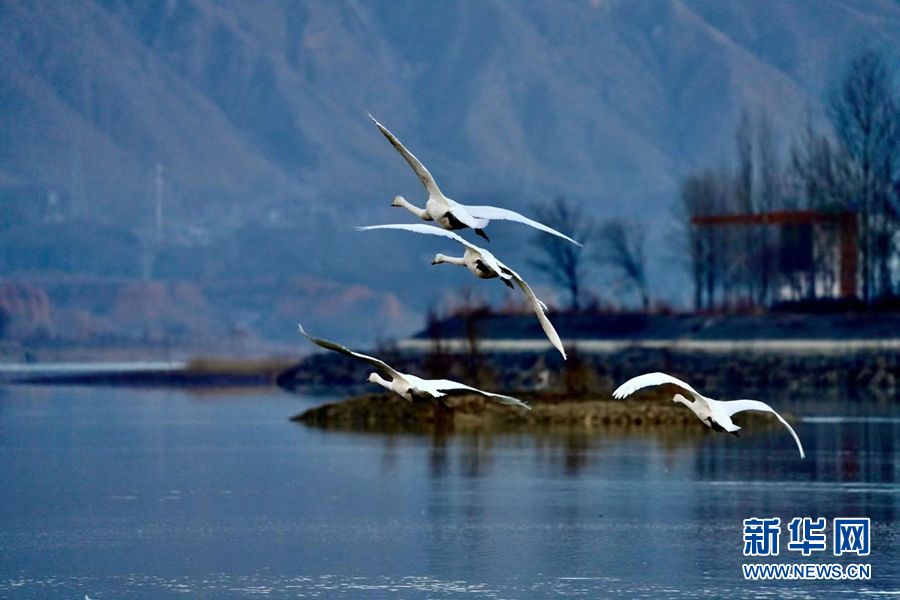 四只大天鵝飛過水面。新華網(wǎng)發(fā)(李玉峰 攝)