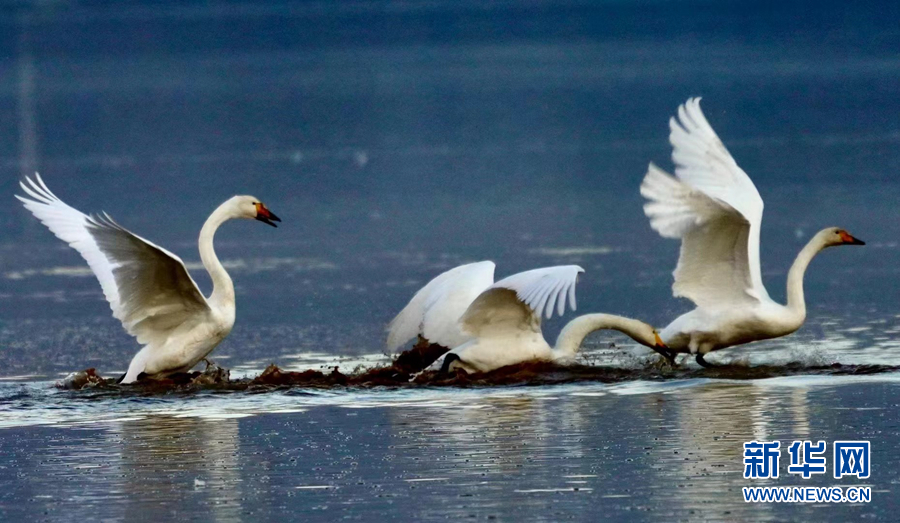 三只大天鵝在水面嬉戲。新華網(wǎng)發(fā)(李玉峰 攝)