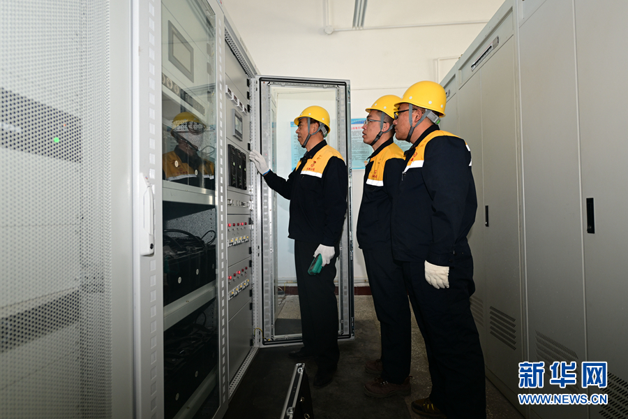 2月5日,在青藏集團(tuán)有限公司西寧供電段格爾木南變電所,王永忠(左二)與同事在巡檢供電設(shè)備。新華社記者 張龍 攝