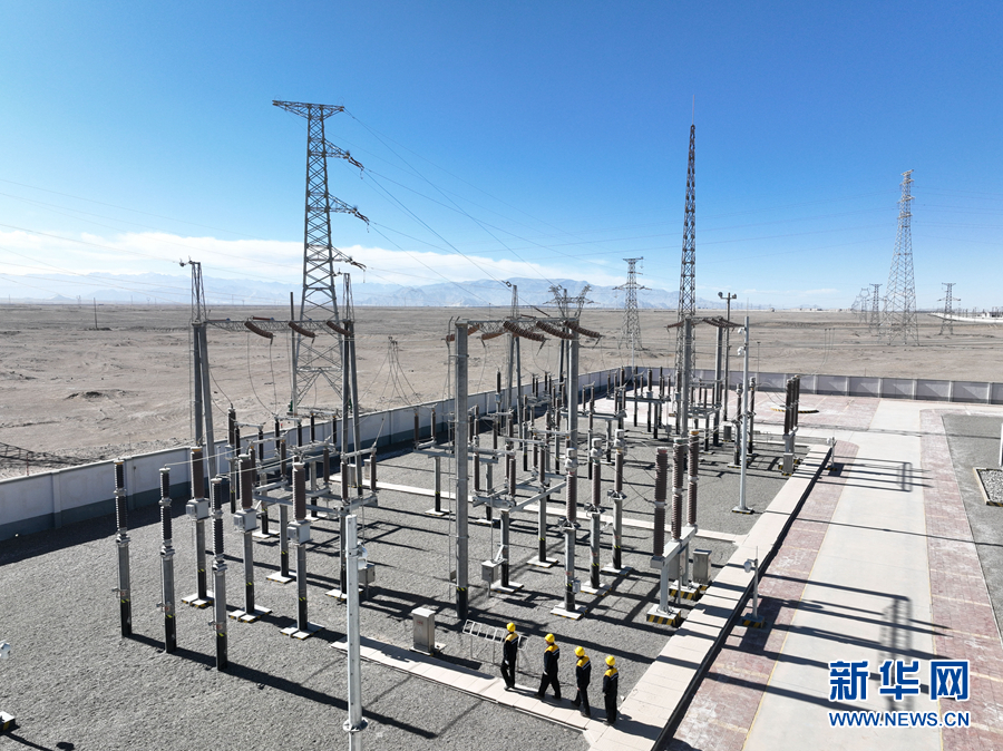 2月5日,在青藏集團(tuán)有限公司西寧供電段格爾木南變電所,王永忠(左一)與同事們?cè)谘矙z(無人機(jī)照片)。新華社記者 張龍 攝