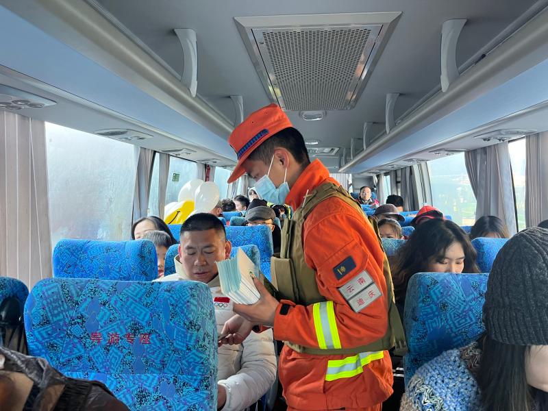 在普達措國家公園停車場,消防指戰(zhàn)員向游客們發(fā)放《防火宣傳冊》,并將游客的火機進行收納統(tǒng)一保管。