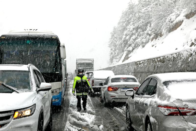 2月22日,大雪使白馬雪山路面積雪結冰,導致上百輛汽車擁堵滯留,交警冒著嚴寒疏導交通。