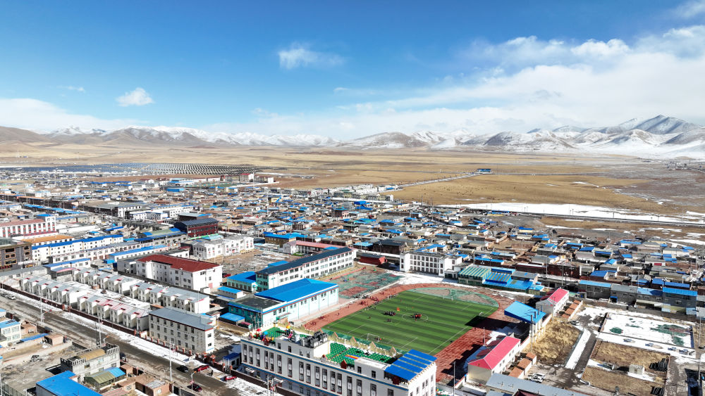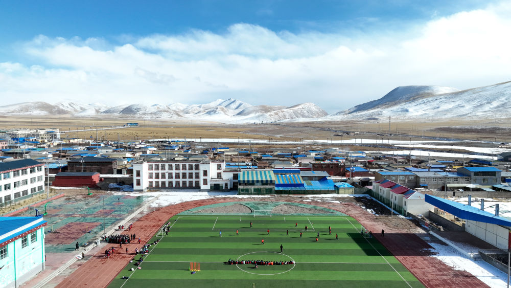 3月1日,在玉樹州曲麻萊縣,曲麻萊縣第一完全小學(xué)學(xué)生在足球課上(無人機照片)。新華社記者 張宏祥 攝
