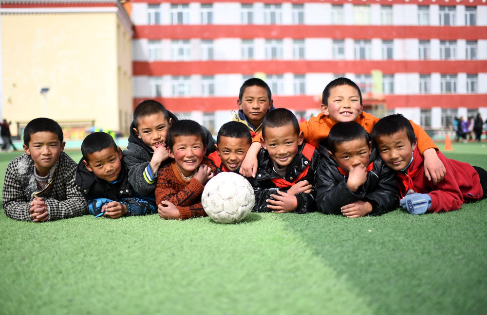3月1日,在玉樹州治多縣,吉尕小學(xué)二年級學(xué)生才仁巴?。ㄗ笏模┖托』锇閭冊趯W(xué)校的球場上。新華社記者 張宏祥 攝