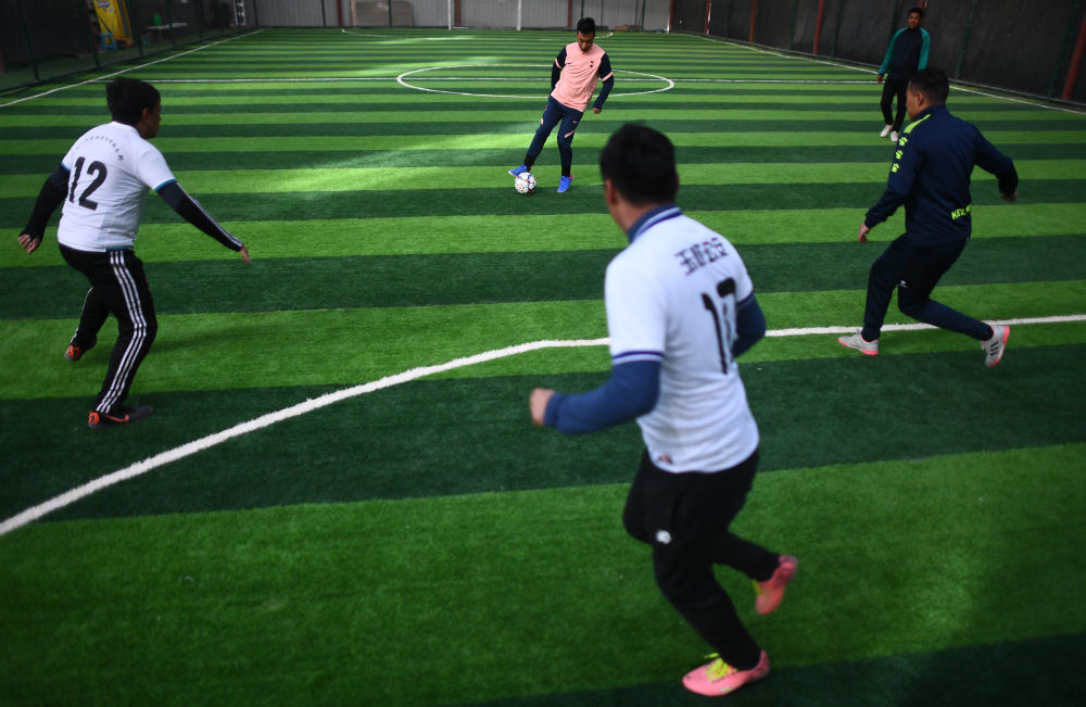 3月2日,在玉樹州玉樹市一處室內(nèi)球場,幾名足球愛好者正在踢球。新華社記者 張宏祥 攝