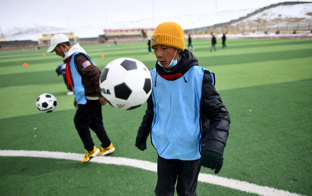 3月1日,在玉樹州曲麻萊縣第一完全小學(xué),曲麻萊青訓(xùn)隊球員在訓(xùn)練課上。新華社記者 張宏祥 攝