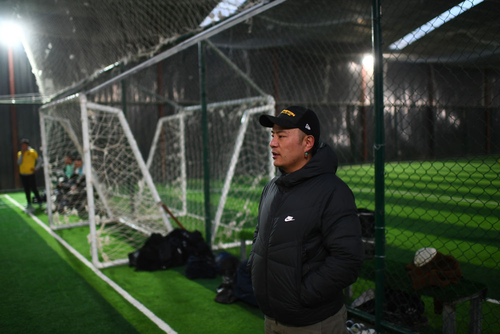 3月2日,在玉樹州玉樹市一處室內(nèi)球場,玉樹康巴野牦牛足球隊領(lǐng)隊格萊永培觀看比賽。新華社記者 張宏祥 攝
