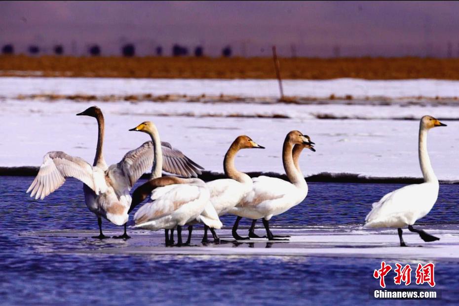 高原初春,在素有“高原藍寶石”之稱的青海湖,記者拍攝到成群大天鵝在湖面上練習(xí)起飛、降落、滑行。青海國家公園觀鳥協(xié)會會長王艦艇介紹,每年3月中旬,在青海越冬的大天鵝都會踏上北遷繁殖路。目前在青海湖的大天鵝多為青海東部黃河流域的“冬候鳥”,在青海湖短暫停留后北遷到夏季繁殖地,在秋末初冬時又會“舉家”回歸來到越冬地。大天鵝屬雁形目鴨科天鵝屬,為國家二級重點保護野生動物,在國內(nèi)主要繁殖于新疆巴音布魯克,主要越冬地有天津及河北沿海、山東榮成和東營、黃河中下游濕地、甘肅、青海、新疆等地。青海湖作為大天鵝的主要越冬地之一,開闊的湖面、涌流的泉水與充足的食物為大天鵝提供了適宜的棲息環(huán)境。