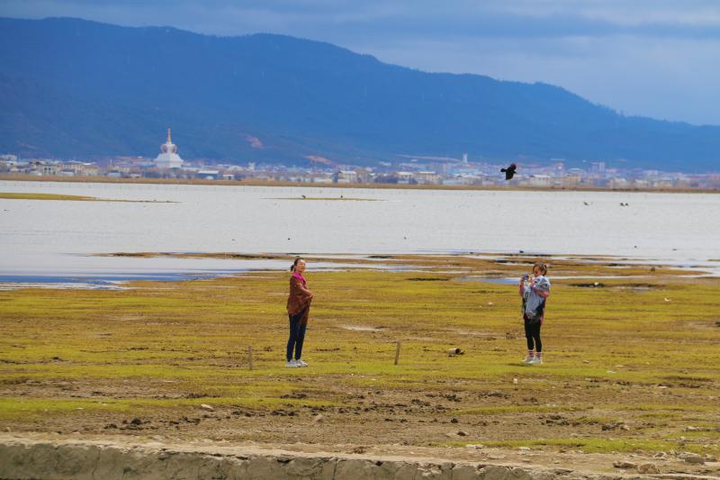 春分節(jié)氣前后,香格里拉氣溫回暖,納帕海的草原也逐漸染綠,游客們?cè)谛蕾p草原春景的同時(shí)也不忘合影留念。