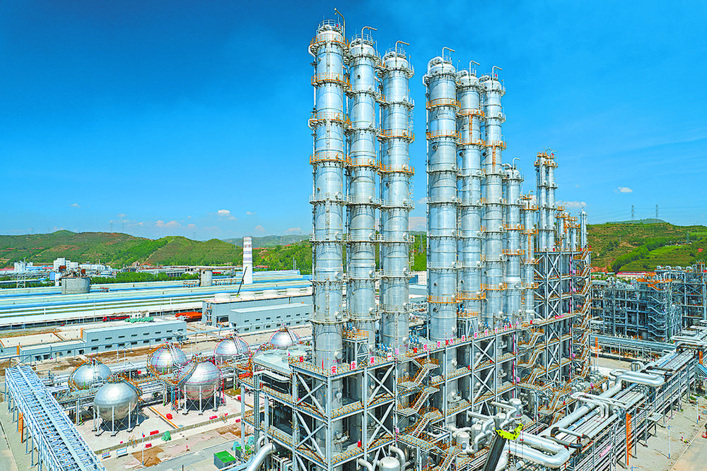 碧藍(lán)天空下,一個個標(biāo)準(zhǔn)化車間錯落有致,一排排提純精餾塔巍然聳立,粗細(xì)不一的銀色管道在廠區(qū)內(nèi)相互編織盤旋,罐區(qū)在“綠電”驅(qū)動下各自忙碌,運(yùn)轉(zhuǎn)的循環(huán)水站奏響春季“生產(chǎn)之歌”……