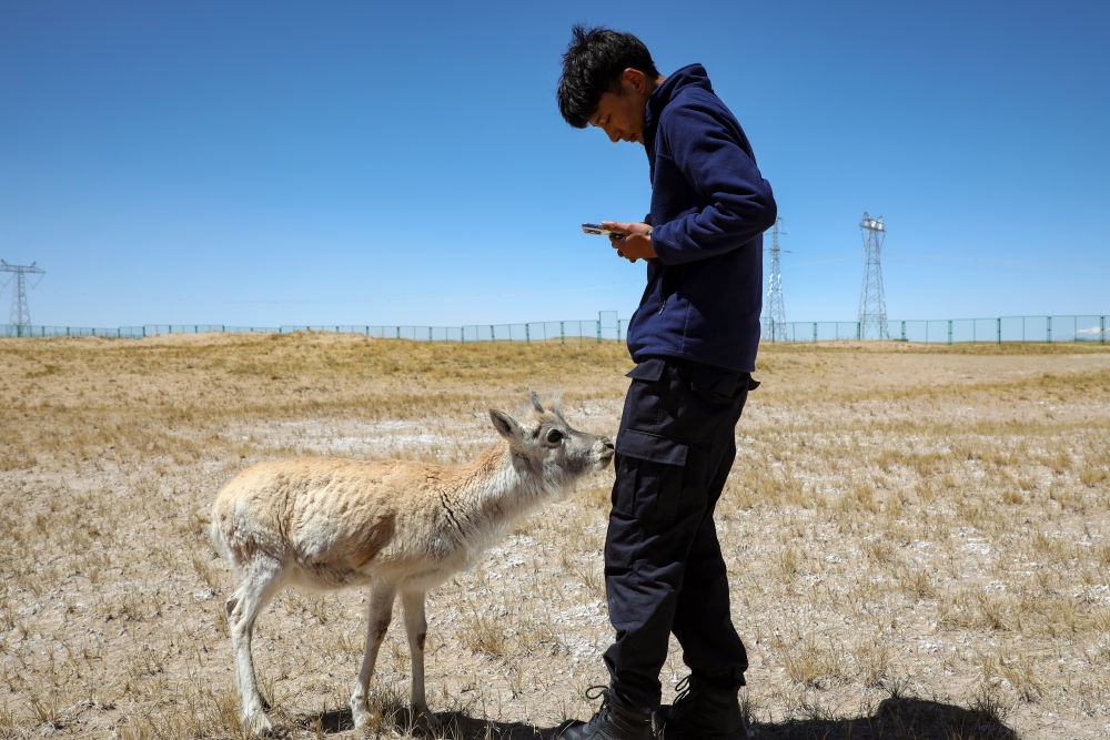 4月15日,巡山隊(duì)員才文多杰在拍攝小藏羚羊生長(zhǎng)情況影像。新華社記者黃豁 攝