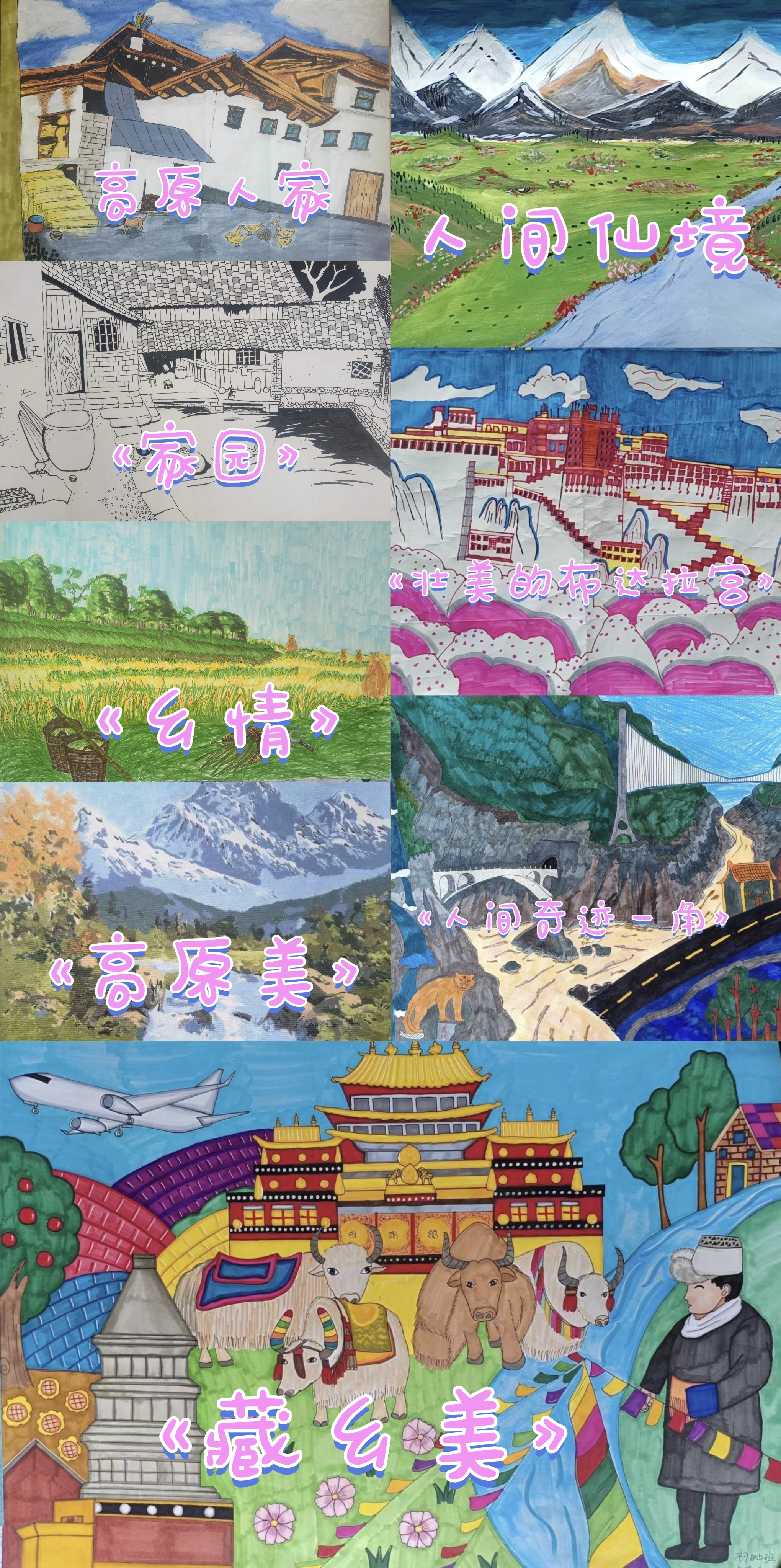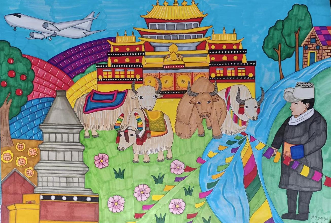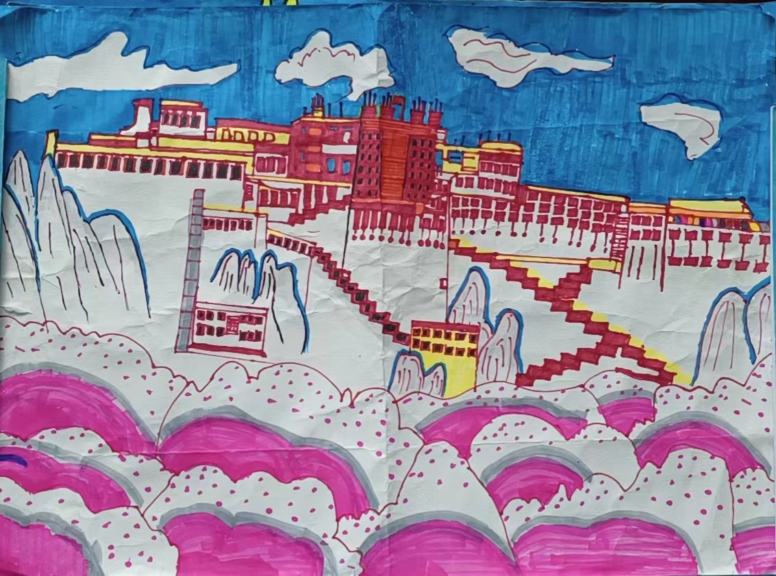 其中,初三年級141班拉茸拉姆作品《高原美》榮獲一等獎。初141班邱霞作品《鄉(xiāng)情》、初二年級153班和凱琪作品《人間奇跡一角》榮獲二等獎。初156班格茸培初作品《壯麗的布達(dá)拉宮》、初一年級161班金安拉姆作品《美麗的松贊林寺》、初164班貢桑措母作品《松贊林寺》榮獲三等獎。