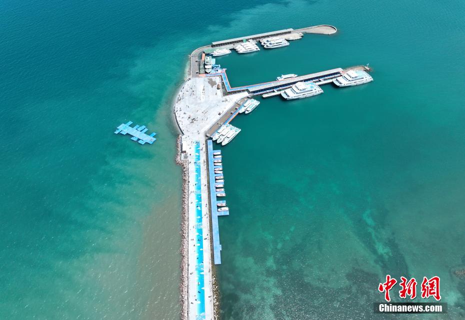 航拍青海湖二郎劍景區(qū)碼頭。
