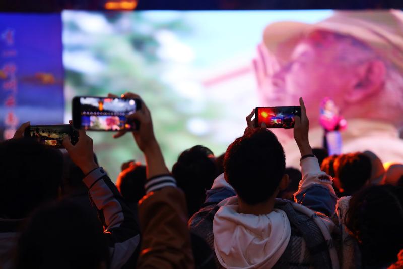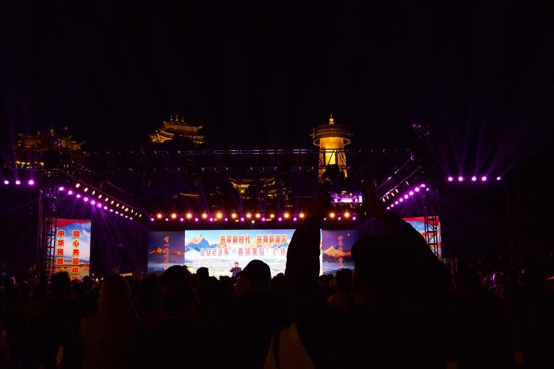 演唱會結束后,“彩云之南等你來”世界的香格里拉歡迎您——夜間群眾文藝演出活動隨即開始,現場燈光閃爍,游客與當地群眾一起,圍著廣場中央的篝火載歌載舞,盡情體驗縱情舞蹈的歡樂。