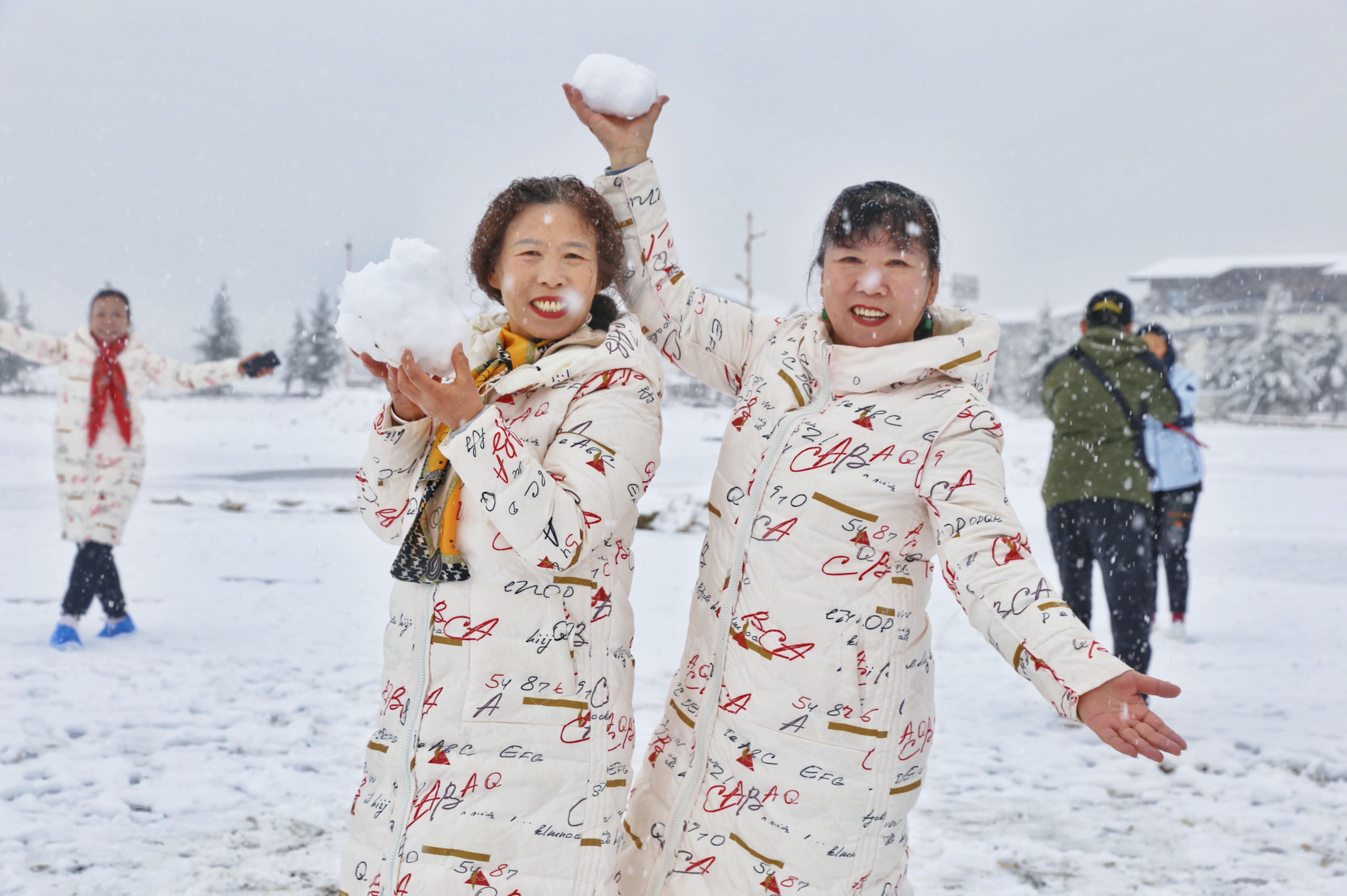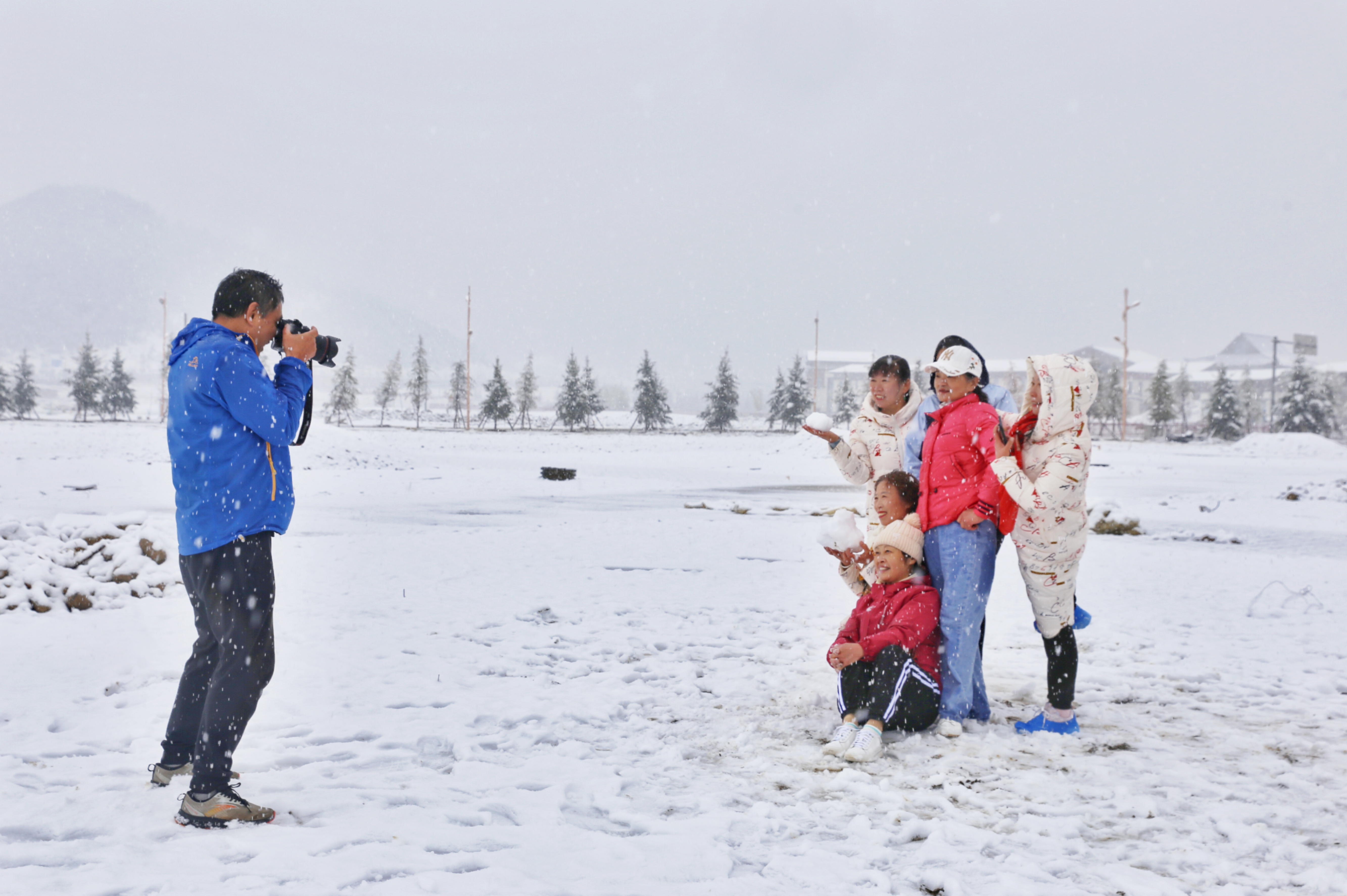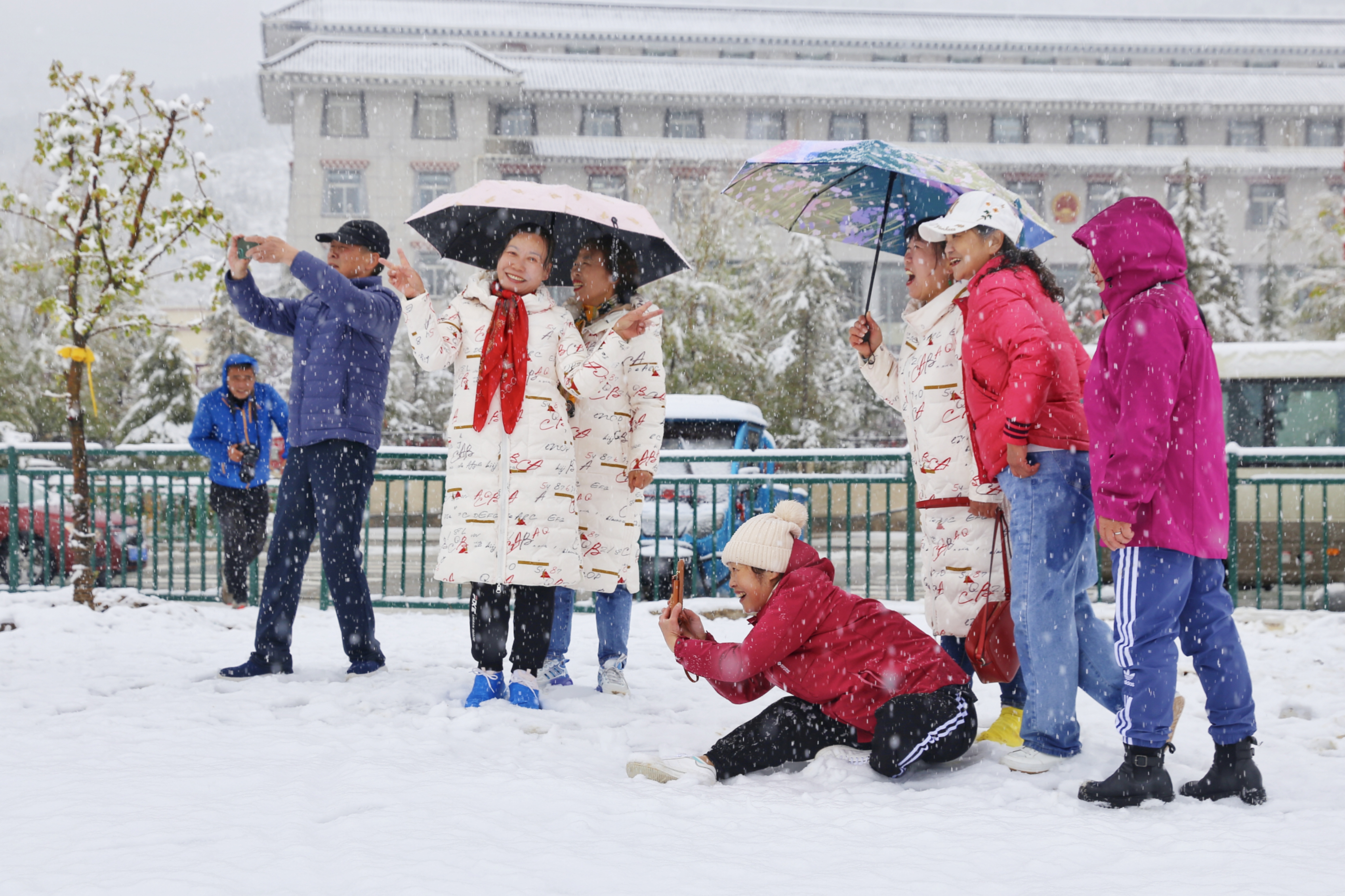 5月15日,香格里拉迎來(lái)一場(chǎng)夏雪,大雪紛飛的雪地中一群來(lái)自貴州的“嬢嬢團(tuán)”正興奮的玩雪、拍照,“太有意思了,五月也能玩到雪,很難得?!苯衲?5歲的劉嬢嬢告訴記者,她們?cè)谙愀窭锢瓮嫒奶炝?,今天?zhǔn)備返程,出城路上被雪景吸引便索性再留出半天時(shí)間看雪。雪地中的嬢嬢們精氣十足,捏雪球、劈腿、下腰、打滾……大家紛紛擺出自己最拿手的pose拍照記錄下這令人驚喜的美景。